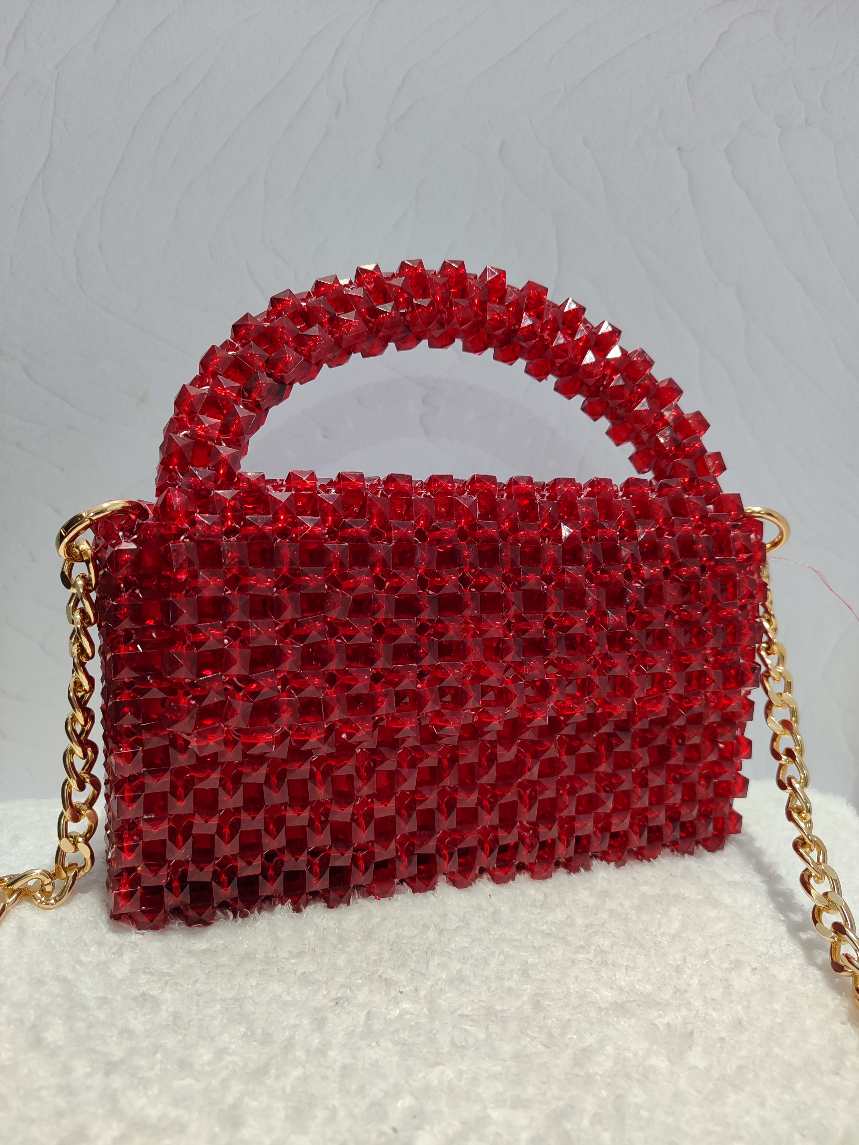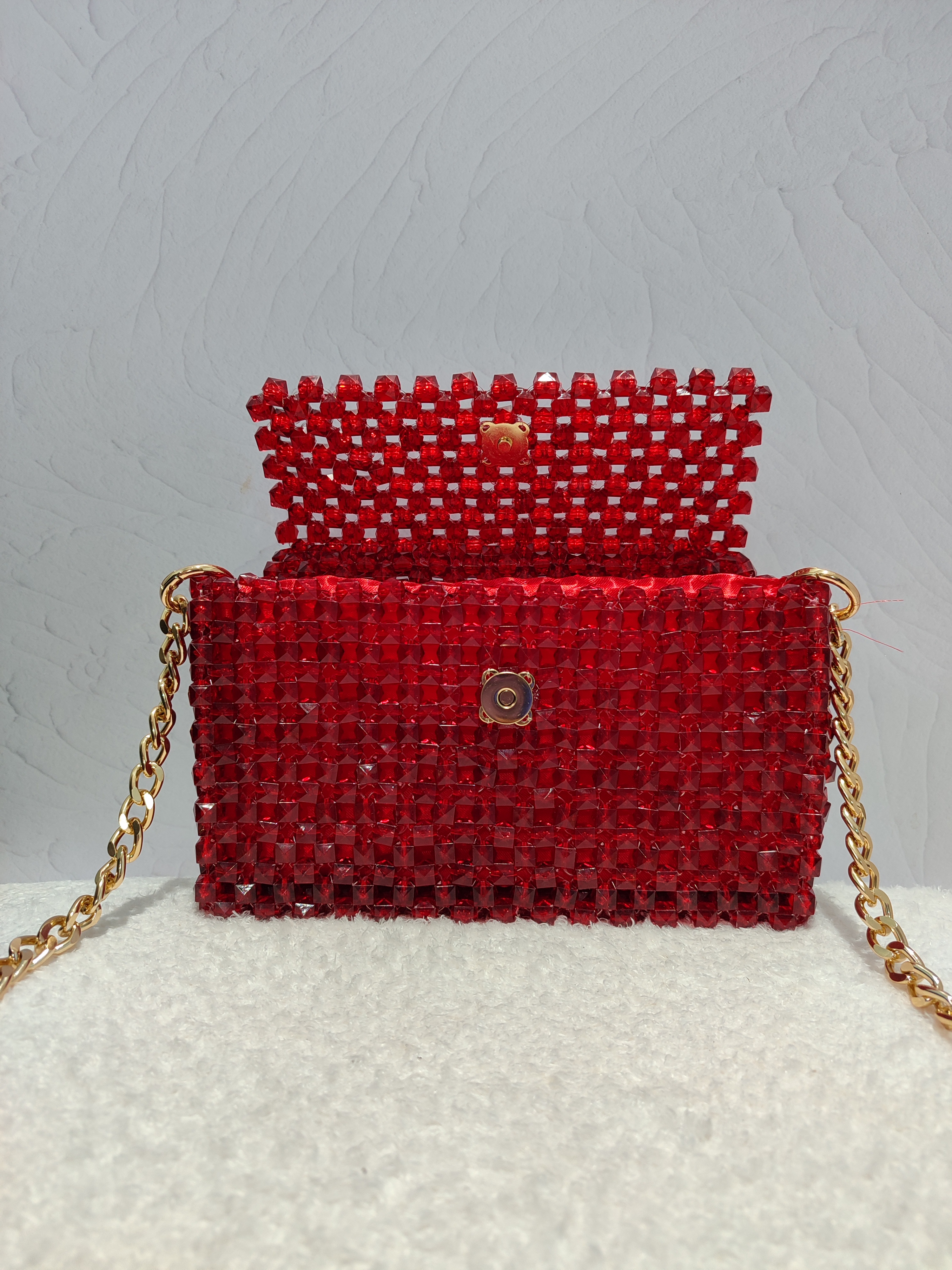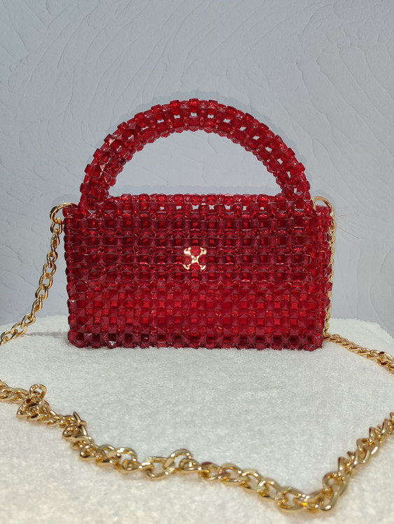 کیف مرواریدی قرمز با کریستال مکعبی بافته شده و فوق العاده محکم، داخل کیف آستر قرمز زیبا خورده و مخصوص مهمونی و تولد و هر جایی هست که دوست دارین بدرخشین